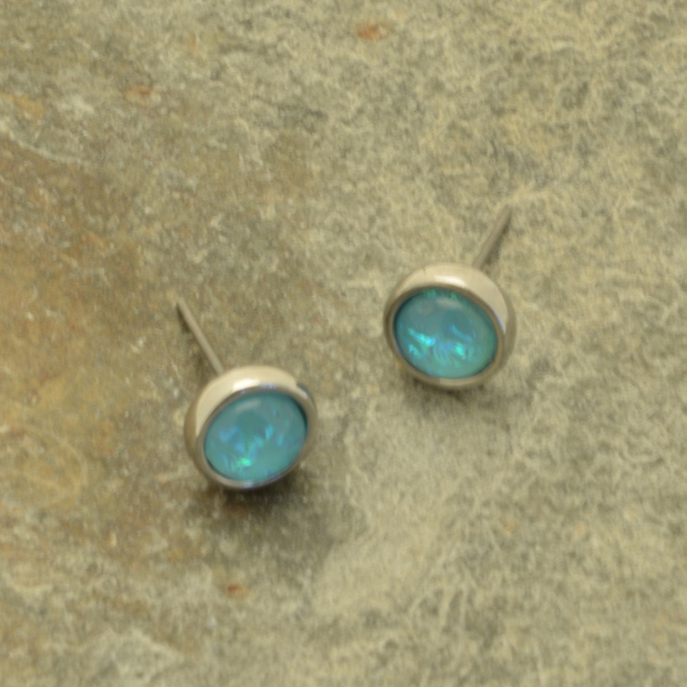 These eye-catching aqua stud earrings are made with an iridescent or opalescent resin, which gives them a lovely shimmer. They are classically simple and timeless with an attractive shiny silver surround.