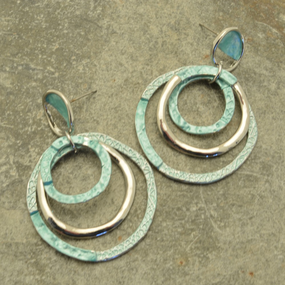 Three irregular circles of differing sizes are handpainted with sections of smooth and textured aqua green in two shades. Combined with shiny silver-coloured metal, these earrings have a contemporary feel and are topped with a fourth half-filled, off-shape circle. The earrings drop 5cm and are 3.5cm wide. They are secured in the ear with a post and silicon stopper.