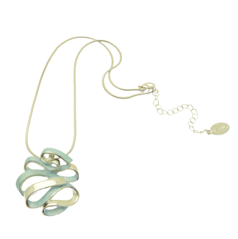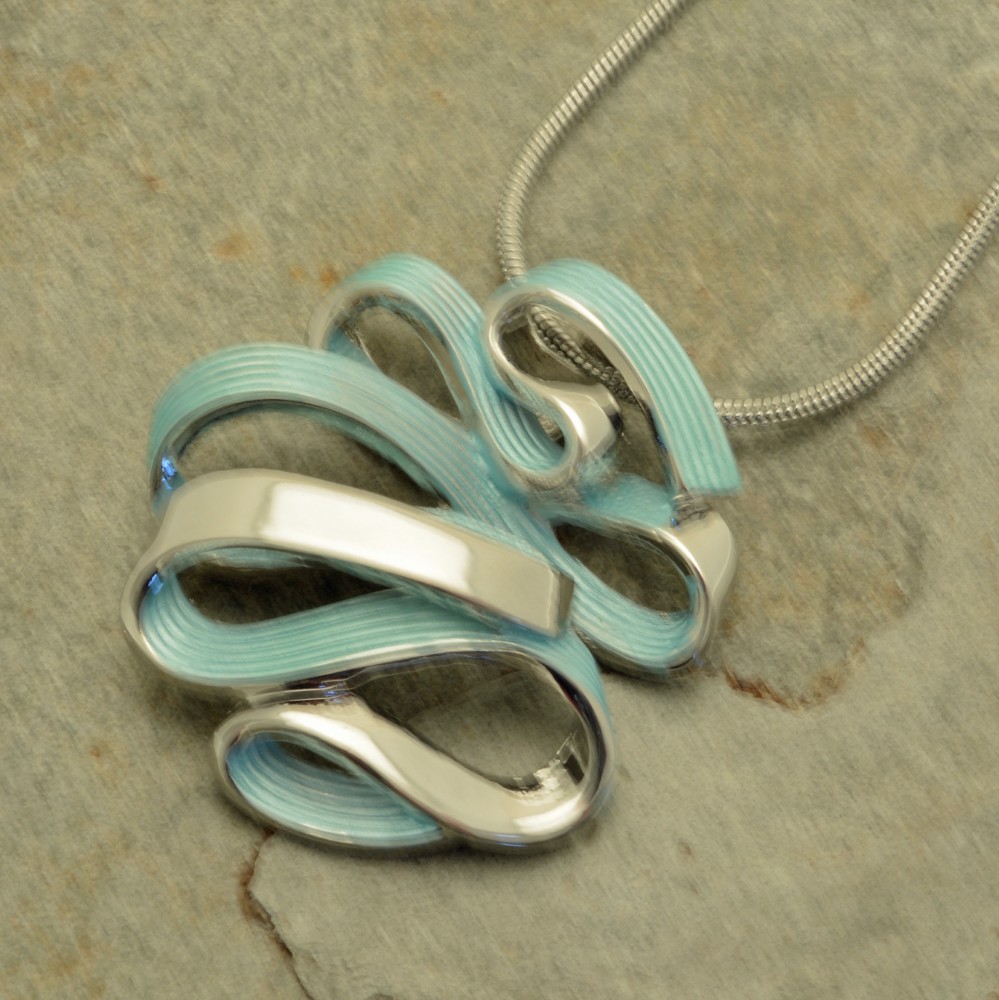 A swirling maelstrom of aqua and silver creates this ocean-inspired necklace. The textured surface of some of the handpainted aqua ribbons adds extra movement and depth to the design. The pendant is 3.8cm high by 3.4cm wide and hangs from a 41cm or 16″ snake chain. The necklace fastens with a lobster clasp and 8cm extension chain.