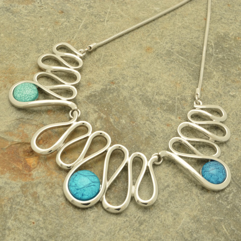 Marbled resin beads of blue, turquoise and mint green sit amidst a silver-coloured swirling metal creation. The necklace sits beautifully around the base of the neck and is 41cm /16″ in length, fastening with a lobster clasp and 8cm extender.