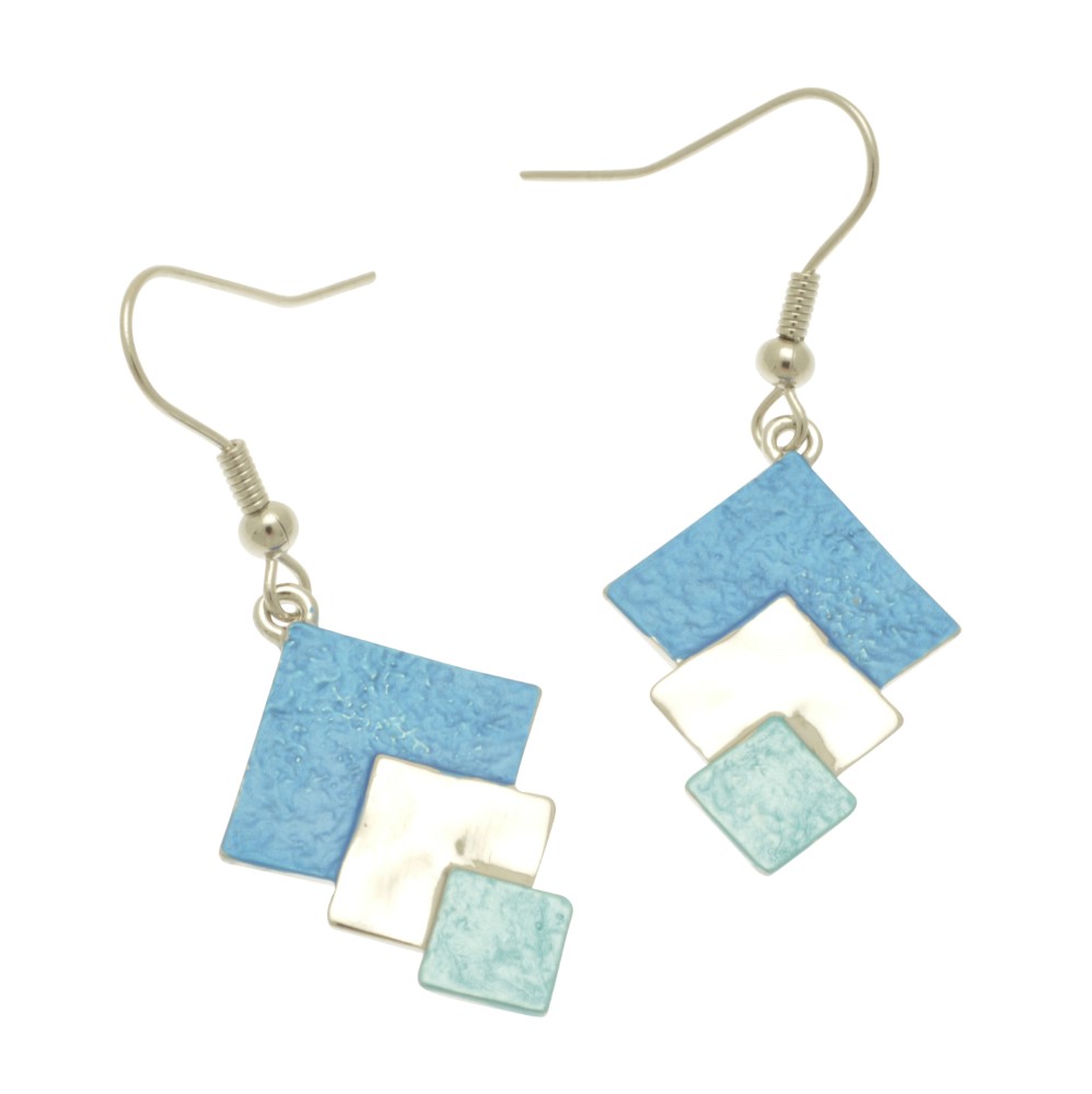 Stylishly combined with imitation silver plating, these lovely mid blue and turquoise earrings hang approximately 2.5cm from the base of fishhooks.