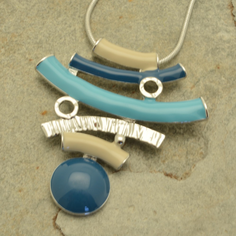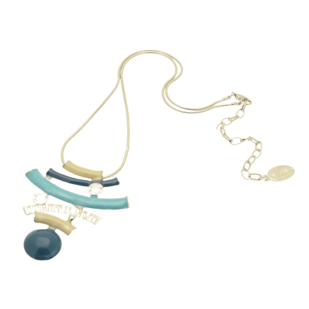 A striking modern statement piece featuring layered arcs in crisp cream, bold blue and vibrant turquoise, accented with a textured silver-coloured arc. Its bold geometric design and glossy detailing create a contemporary look that pairs effortlessly with both casual and elegant styles. The pendant is 4.8cm high by 4.6cm wide and hangs from a snake chain of 41cm or 16″. The necklace fastens with a lobster clasp and 8cm extension chain.