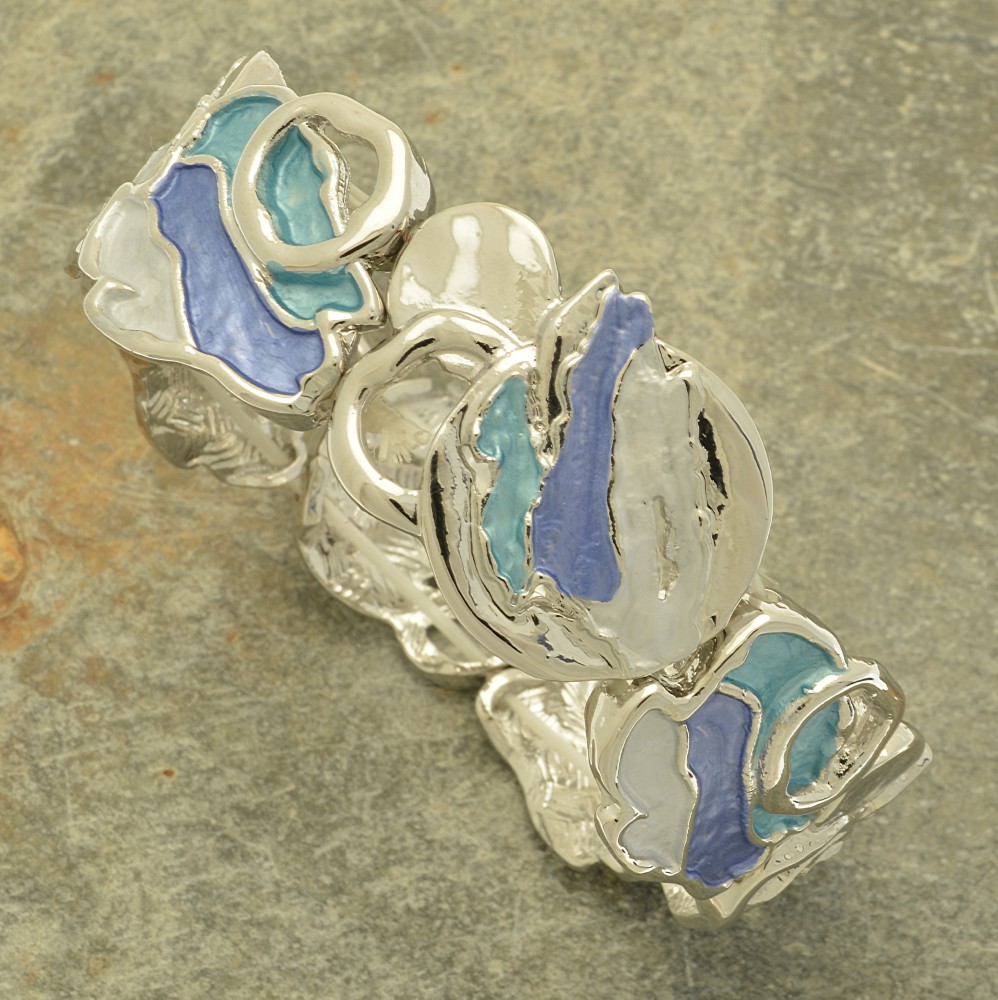 How do you turn rolling, blue and turquoise waves with dancing white horses into a bracelet? Like this. The silver-coloured framing to this abstract, contemporary design works brilliantly to hold it together. The bracelet is 2.2cm high and is elasticated, making it easy to put on and take off, and suitable for different wrist sizes.