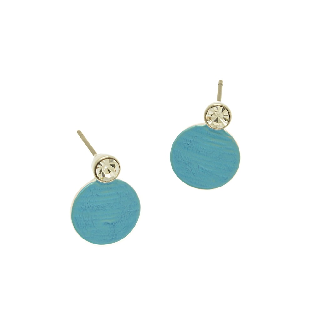 A delicate disc hand-painted in petrol blue is topped with a sparkly crystal. The earring is 1.2cm high by 1cm wide and is held in the ear with a post and silicon butterfly.