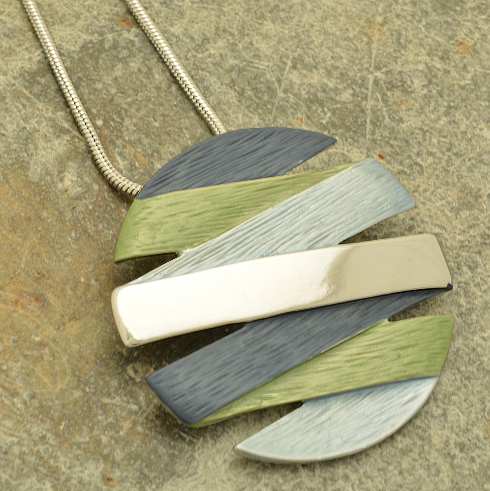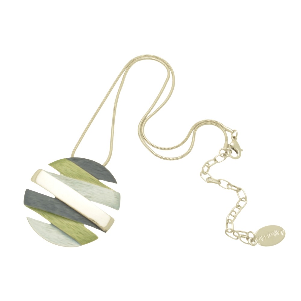 A vibrant combination of navy and powder blue plus lime green ribbons swathe a silver disc pendant to create this attractive design, which is approximately 5cm in diameter. The necklace measures 41cm long and fastens with a lobster clasp and 8cm extension chain.