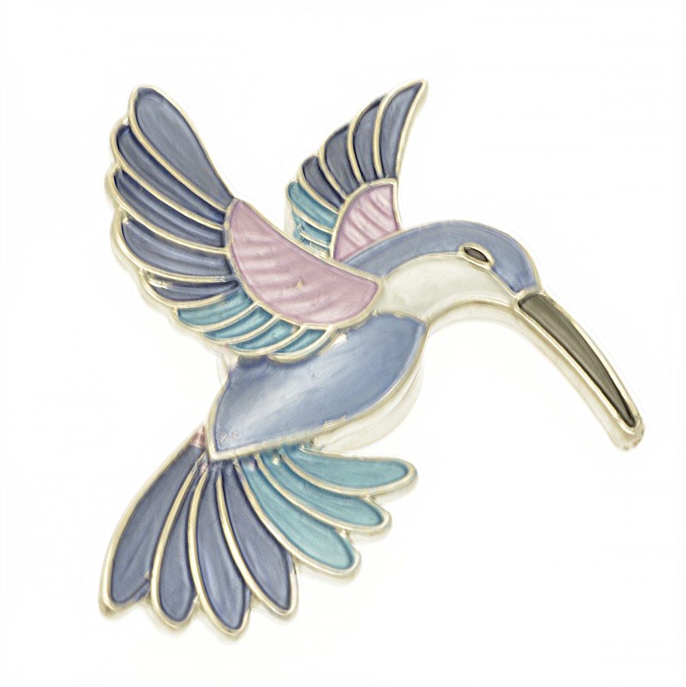 Captured in the midst of its phenomenal wing flapping, this lovely hummingbird brooch is intricately painted in dark and light blue with touches of purple and white. The magnetic brooch is 6cm by 5cm and is held in place with a strong magnet. It can easily be moved between clothing, hats, scarves and bags without making holes, and can be used to decorate anything made of metal.