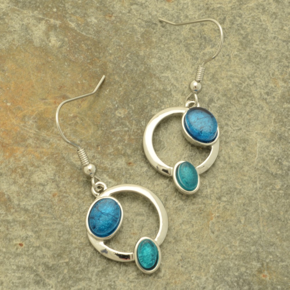 These minimalist drop earrings feature a shiny silver-coloured hoop adorned with two resin lozenges in bold blue and turquoise. The resin is backed with marbled paper, giving it texture and depth. The earrings measure 2cm high by 1.5cm wide and hang from fishhooks.