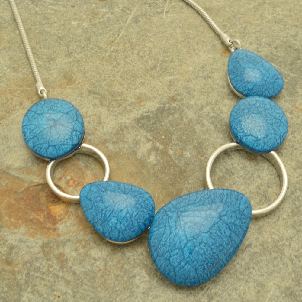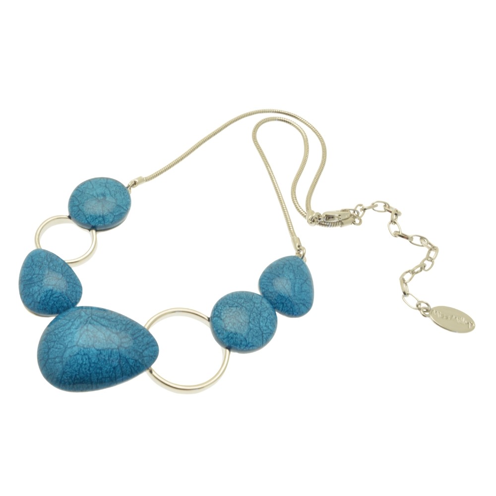 In a rich, denim blue, this necklace has impact. The resin is backed with a marbled paper giving it texture and depth. The largest pebble measures 3cm by 2.5cm and the five pebbles are joined by two silver hoops. The necklace is 41cm long and fastens with a lobster clasp and 8cm extension chain.
