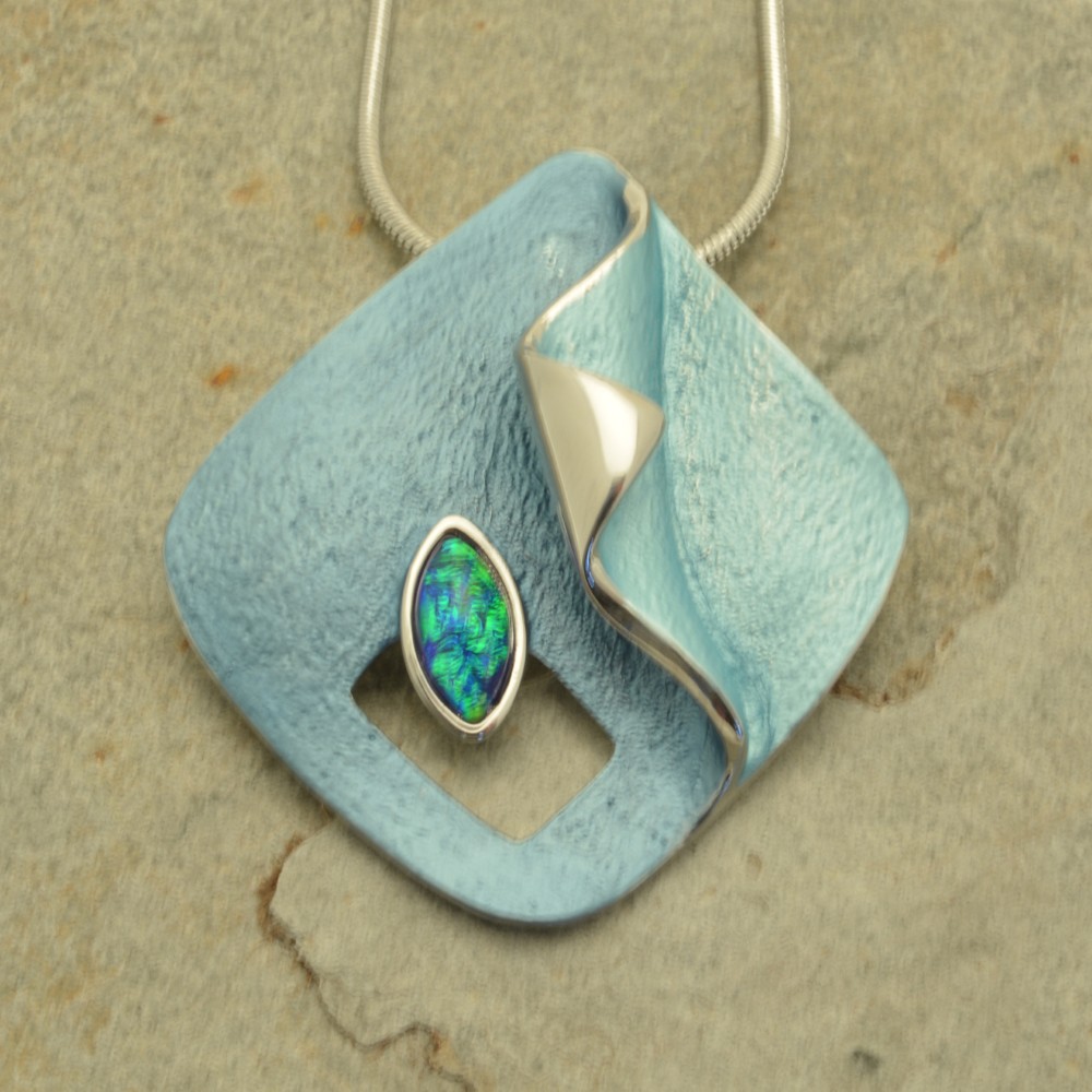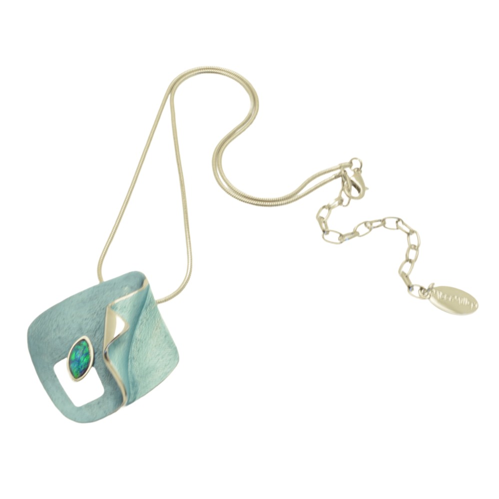 This stylish necklace peels away a petrol blue layer to reveal a pretty turquoise inner edged in silver. The iridescent blue-green resin elliptical bead perched on the edge of a rectangular hole add interest to this contemporarily styled necklace. The pendant is 4cm by 4cm and hangs from a 16″ / 41cm snake chain that fastens with a lobster clasp and 8cm extender.
