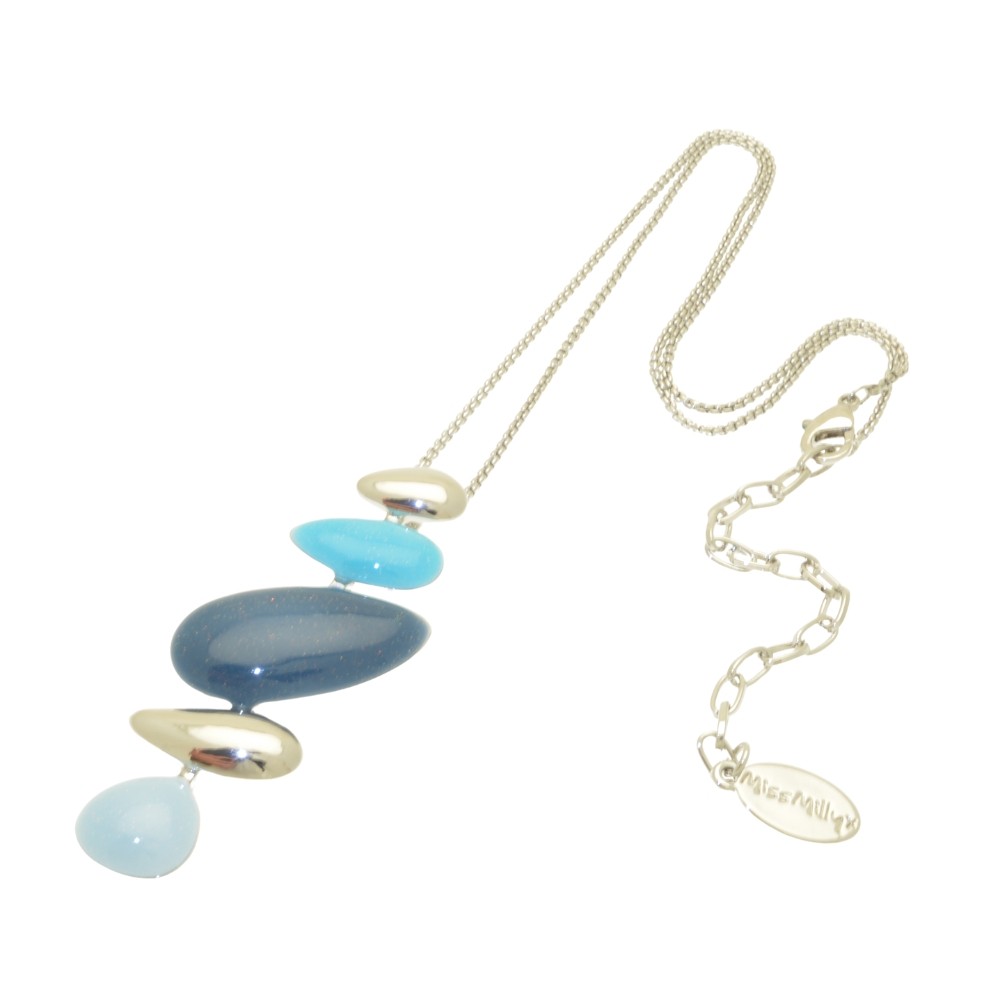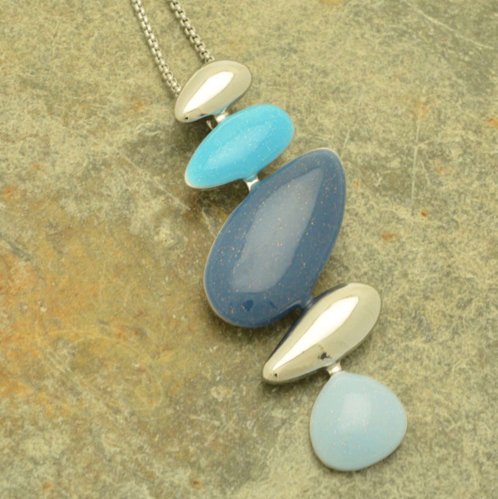 Combining silky smooth petrol blue, turquoise and powder blue glossy finishes with shiny silver, this necklace resembles a stack of pebbles on the beach. The pendant is approximately 6cm high by 3.5cm wide and hangs from a 41cm / 16″ chain with lobster clasp and 8cm extender.