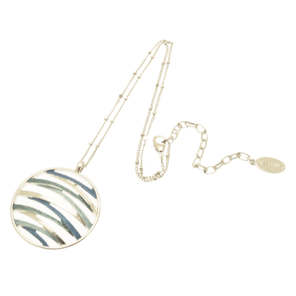 A woven style, hand-painted necklace in three complementary blues with highlights of silver. The pendant is 3.5cm in diameter and hangs from our lovely, knotted style chain, which is 16″ or 41cm long and fastens with a lobster clasp and 8cm extender.