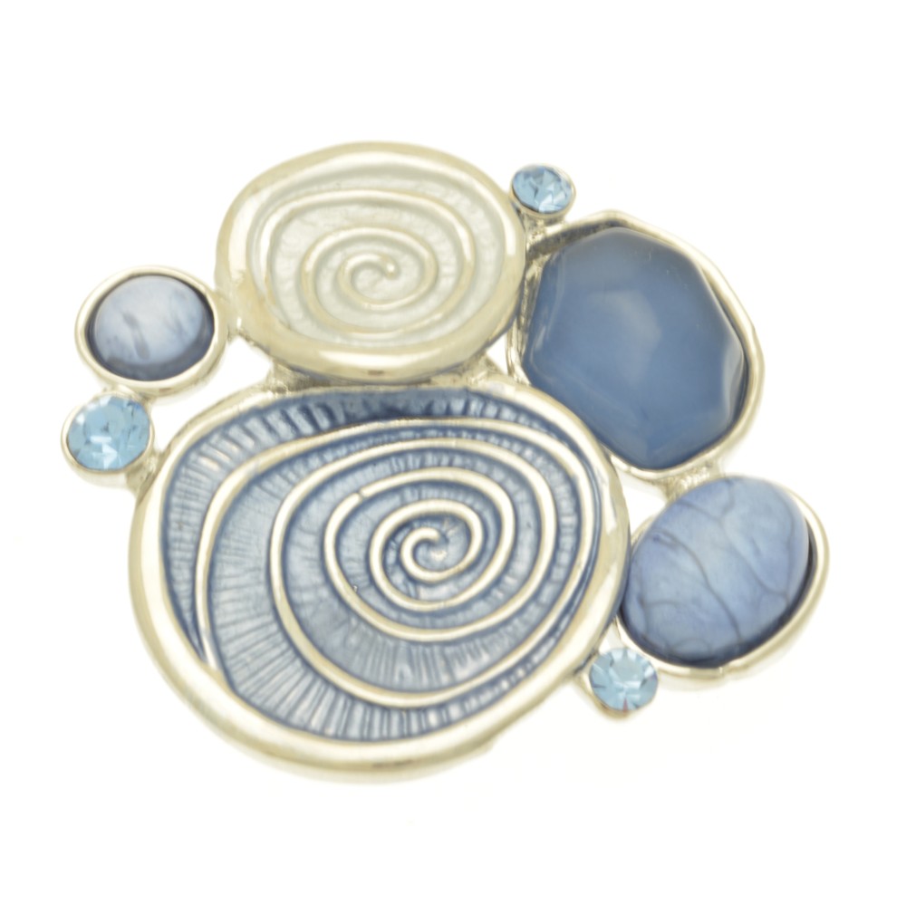 Combining soft blue paint, resins and crystal, this lovely brooch features silver-coloured swirls. The brooch measures 4.6cm by 5cm and is held in place with a strong magnet. It can easily be moved between clothing, hats, scarves and bags without making holes, and can be used to decorate anything made of metal.