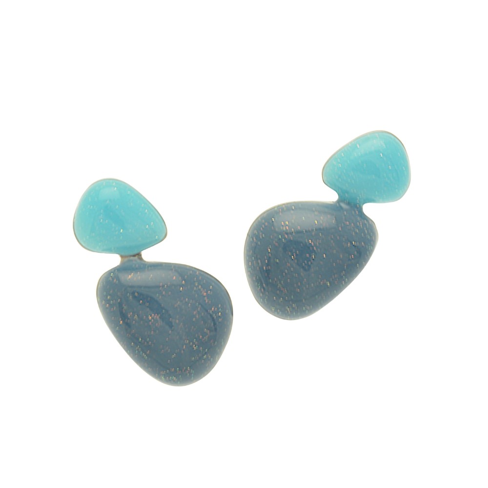 A small turquoise curved triangle sits atop a larger petrol blue one to create these geometric earrings. They are held in place with a stud and silicon butterfly. The earrings measure approximately 2.2cm high by 1cm wide.