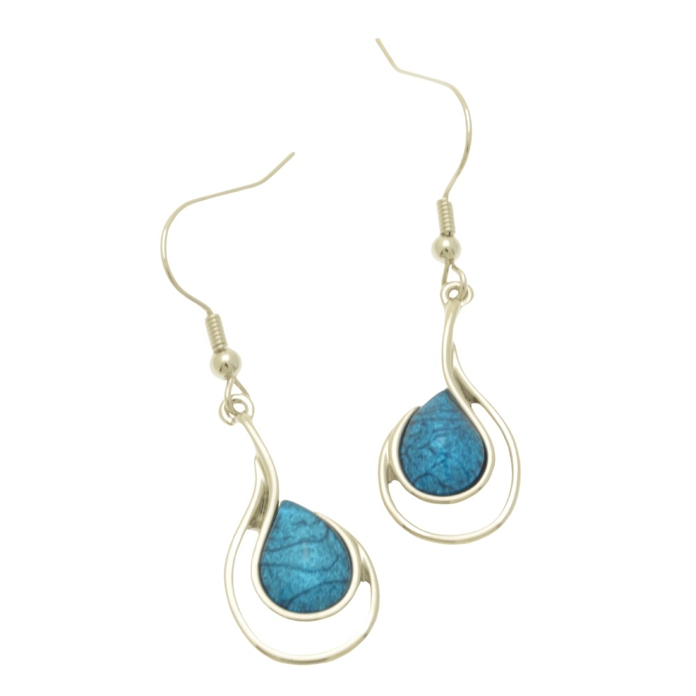 In a bold, bright blue, the resin of these swirl earrings is backed with marbled paper, giving them texture and depth. The earrings hang 3cm down from fishhooks and are 1.5cm wide.