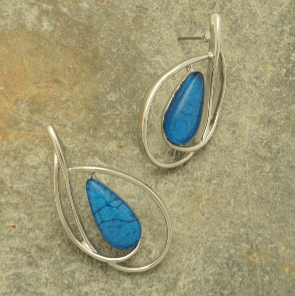 These earrings are created with a stylish teardrop silver-coloured frame holding a piece of bold blue resin that is backed with marbled paper for lustre and depth. The earrings measure approximately 3cm high by 2cm wide and hang from fishhooks.