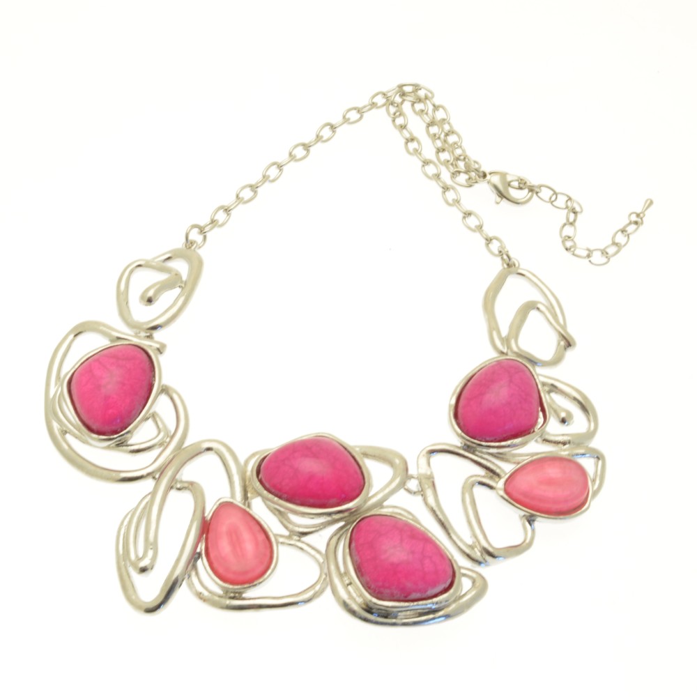 In two lovely shades of fuchsia or cerise pink, this striking necklace uses a framework of silver-coloured metal swirling from one side of the neck to the other with marble resin pebbles dotted throughout. The maximum depth of the metalwork is 4cm and the necklace measures 41cm or 16″ in length. It fastens with a lobster clasp and 5cm extension chain.