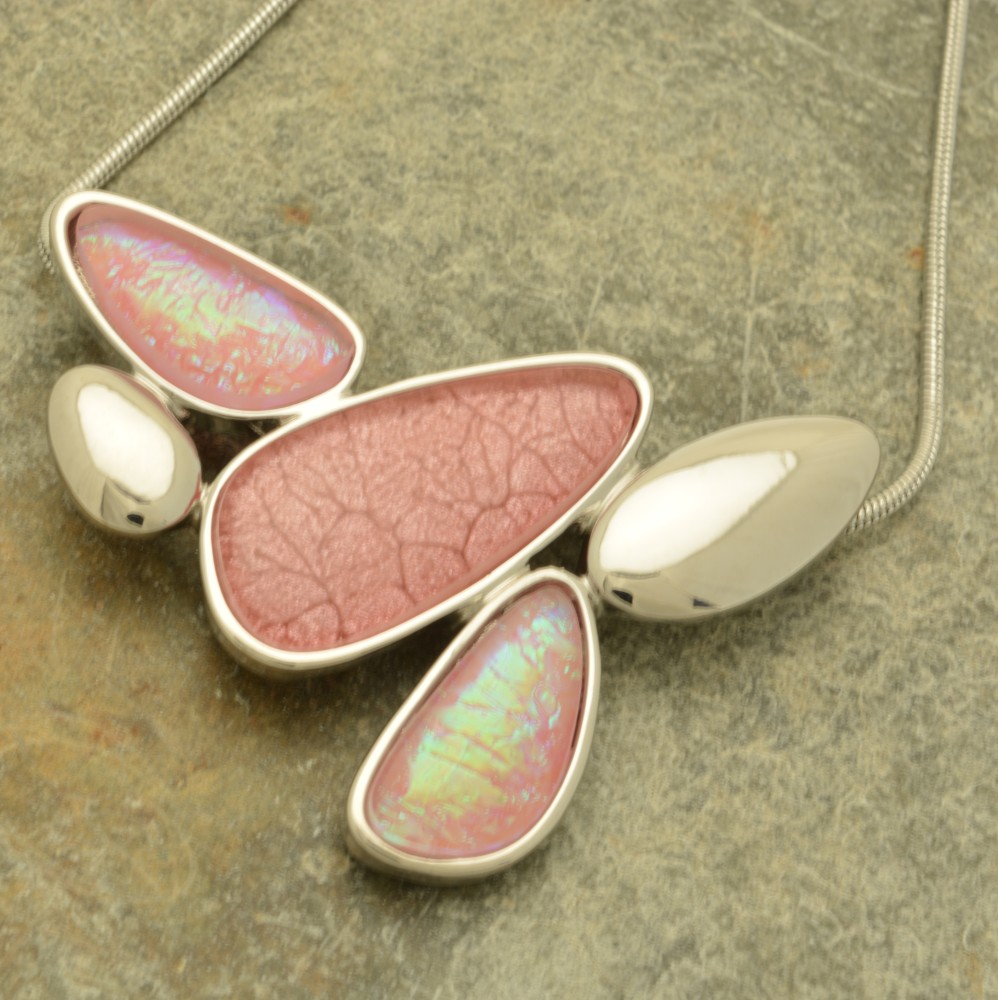 In pretty coral marbled and iridescent resin with silver-coloured elements, this necklace takes the form of a mosaic of pebbles. The decorative element is 3.8cm high by 5cm across and hangs from a 41cm or 16″ snake chain. The necklace fastens with a lobster clasp and 8cm extension chain.