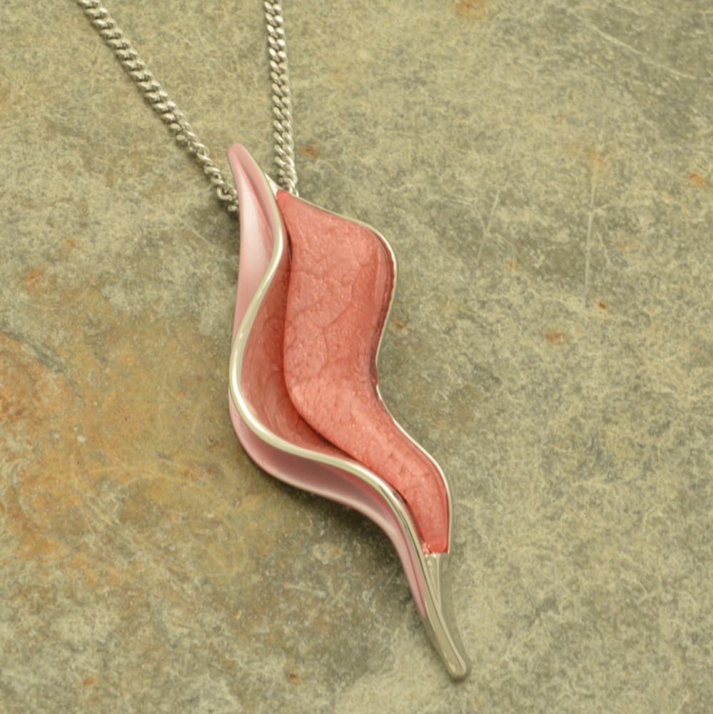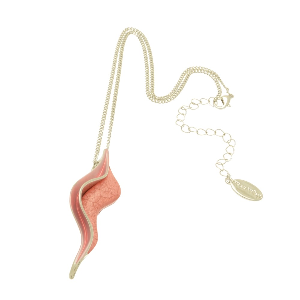 Elegantly simple, the light coral marble resin of the pendant is shadowed on one side by silver-coloured metal. The pendant measures approximately 5cm in length and it hangs from a 41cm/16″ plaited style chain fastening with a lobster clasp and 8cm extender.