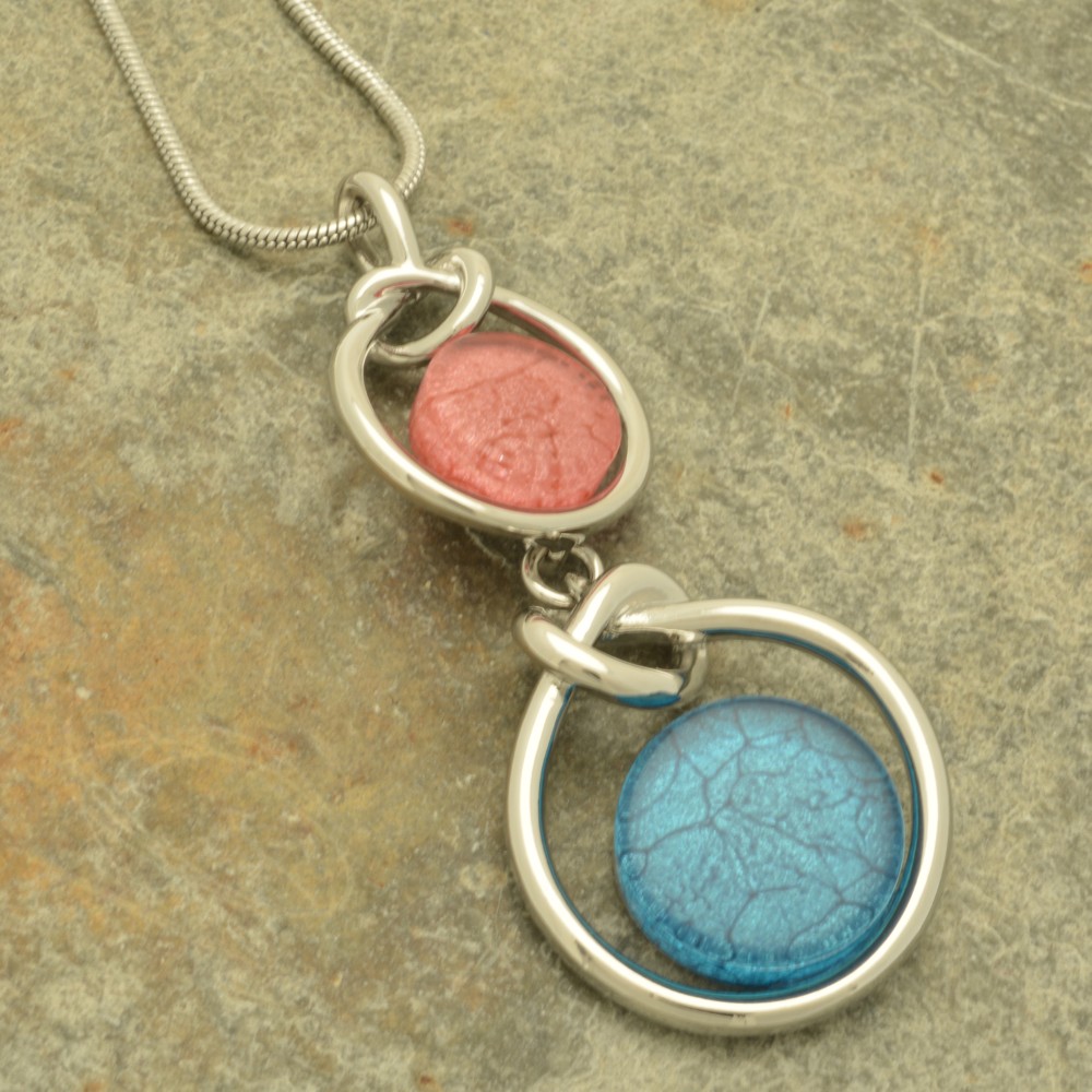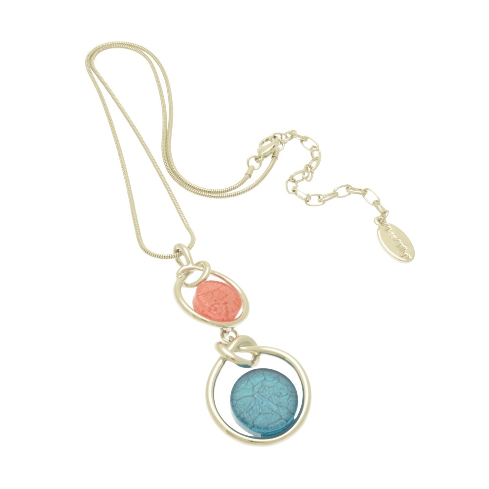 A stylish combination of denim blue with coral makes up this necklace. The resin is backed with marbled paper for depth and texture, and the knotted silver surrounds add interest. The necklace measures 41cm long and fastens with a lobster clasp and 8cm extension chain.