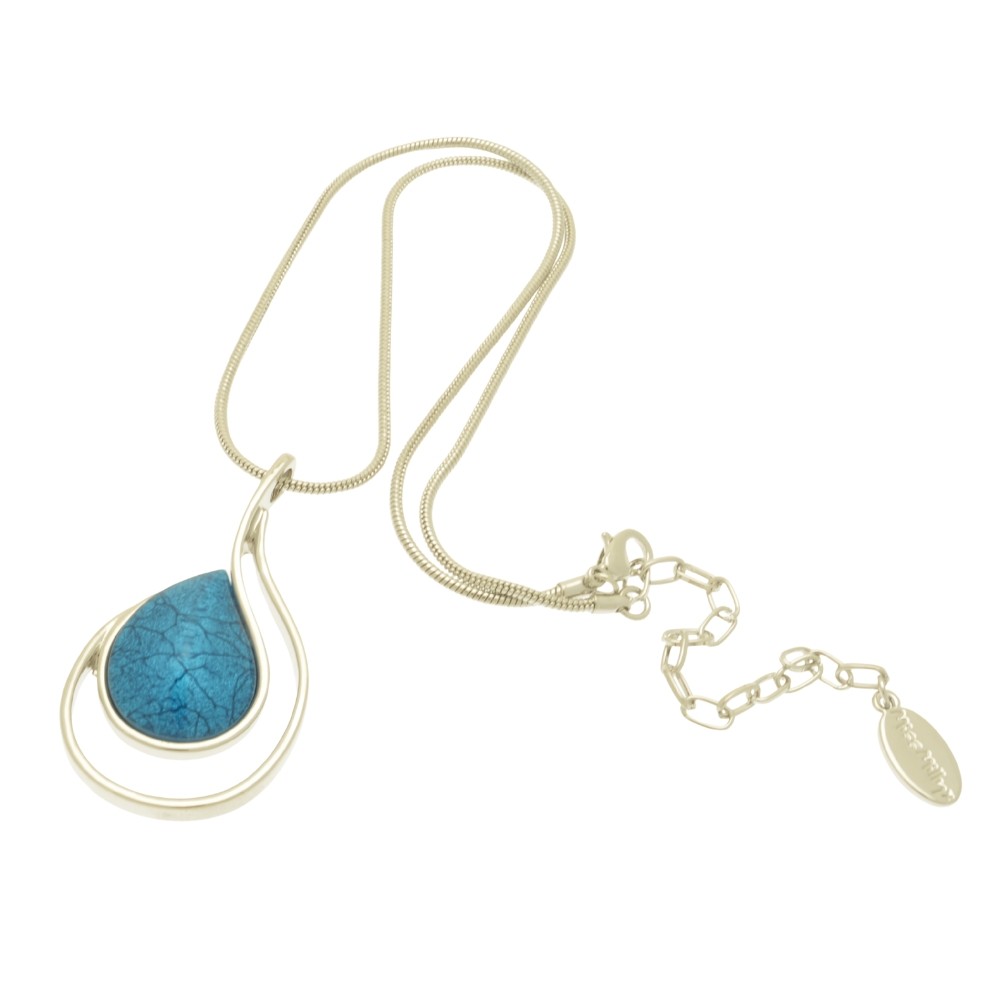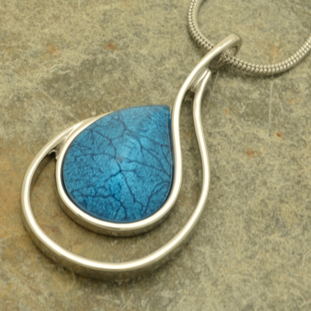 In a striking, mid blue, the resin of this pendant is backed with marbled paper, giving it depth and texture. The pendant measures 5.5cm high by 3cm wide and is hung on a 41cm snake chain with 8cm extender.