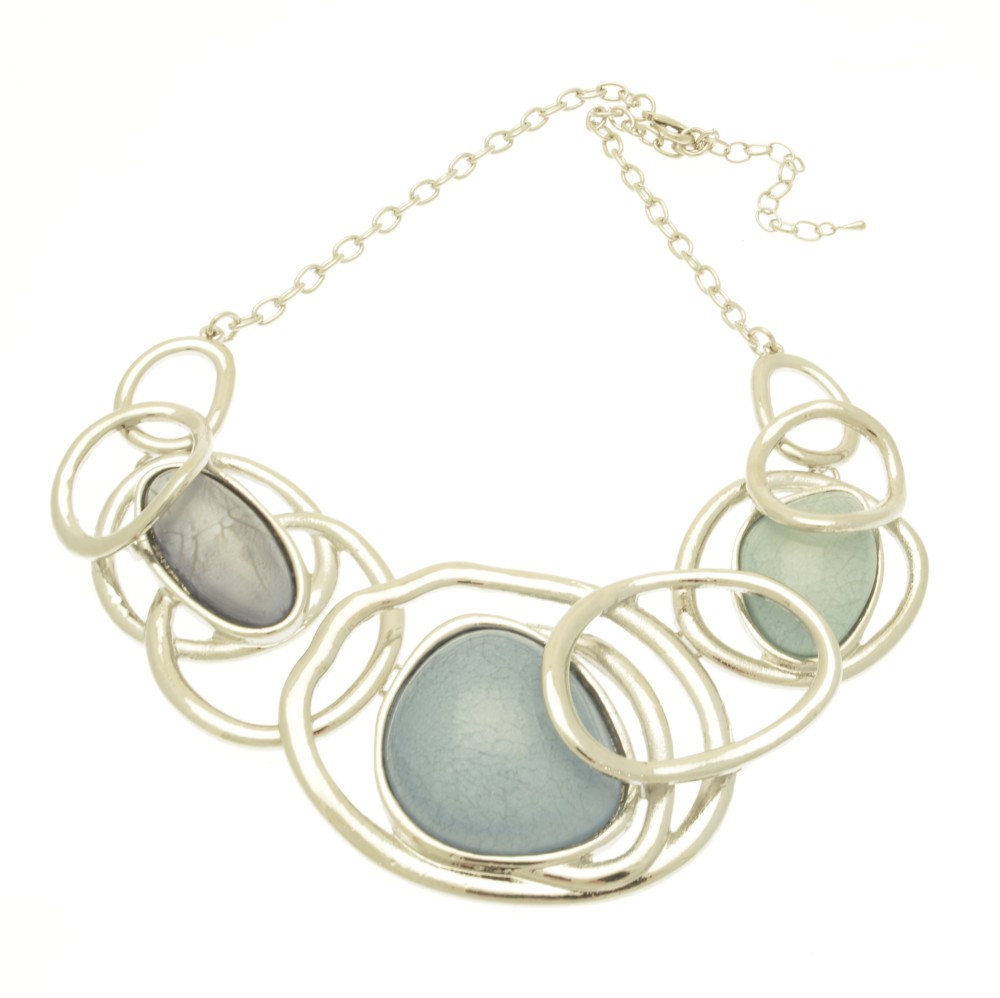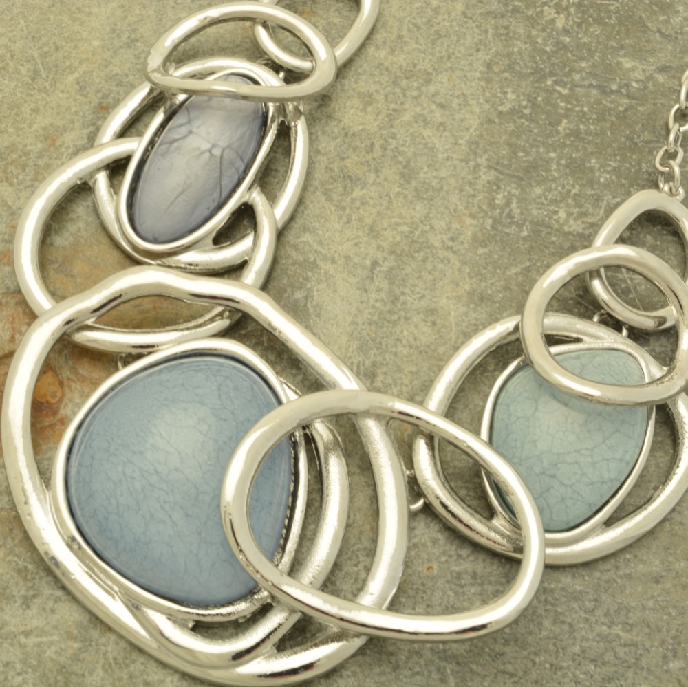 Beautiful, soft colours and head-turning style. This gorgeous necklace makes a real statement with it’s marbled resin pieces in three different muted blues set in irregular hoops of silver. The largest hoop in the middle is 5cm high by 6.5cm wide. The necklace is 41cm or 16″ in length and fastens with a lobster clasp and 5cm extension chain.