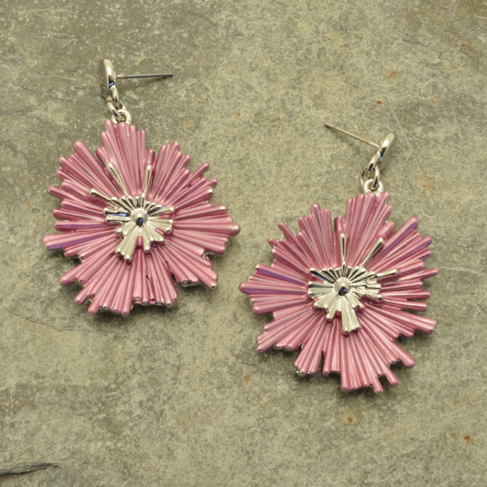 The pretty Delosperma or ice plant has stunning flowers, which shimmer in the light as though covered with frost. They’ve inspired a really striking pair of drop earrings in dusky pink with bold silver-coloured centres. The handpainted flower is approximately 3cm in diameter and drops from a silver-coloured bead with post. The post is secured in the ear with a silicon stopper.