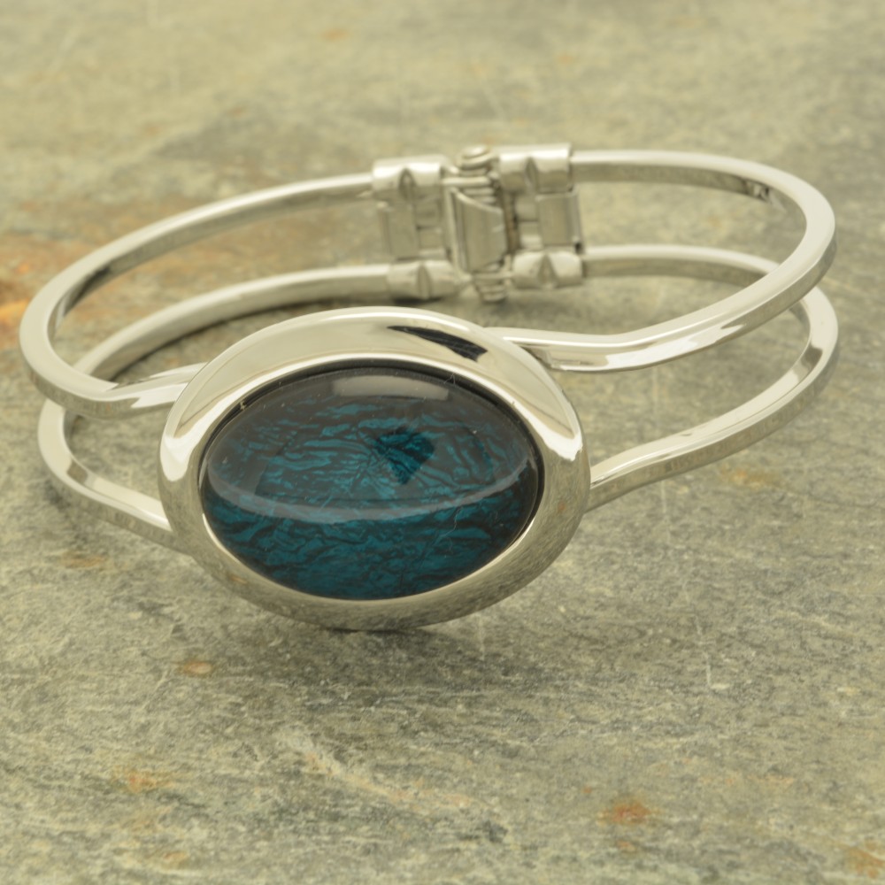 This forest green bangle is our most popular style of bracelet and uses a resin backed with aluminium foil, which gives it an illusion of depth and texture. It has a hinged clasp making it a universal fit. The oval decoration measures approx 3cm by 2.5cm.