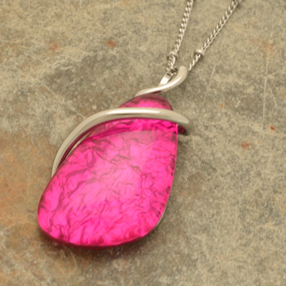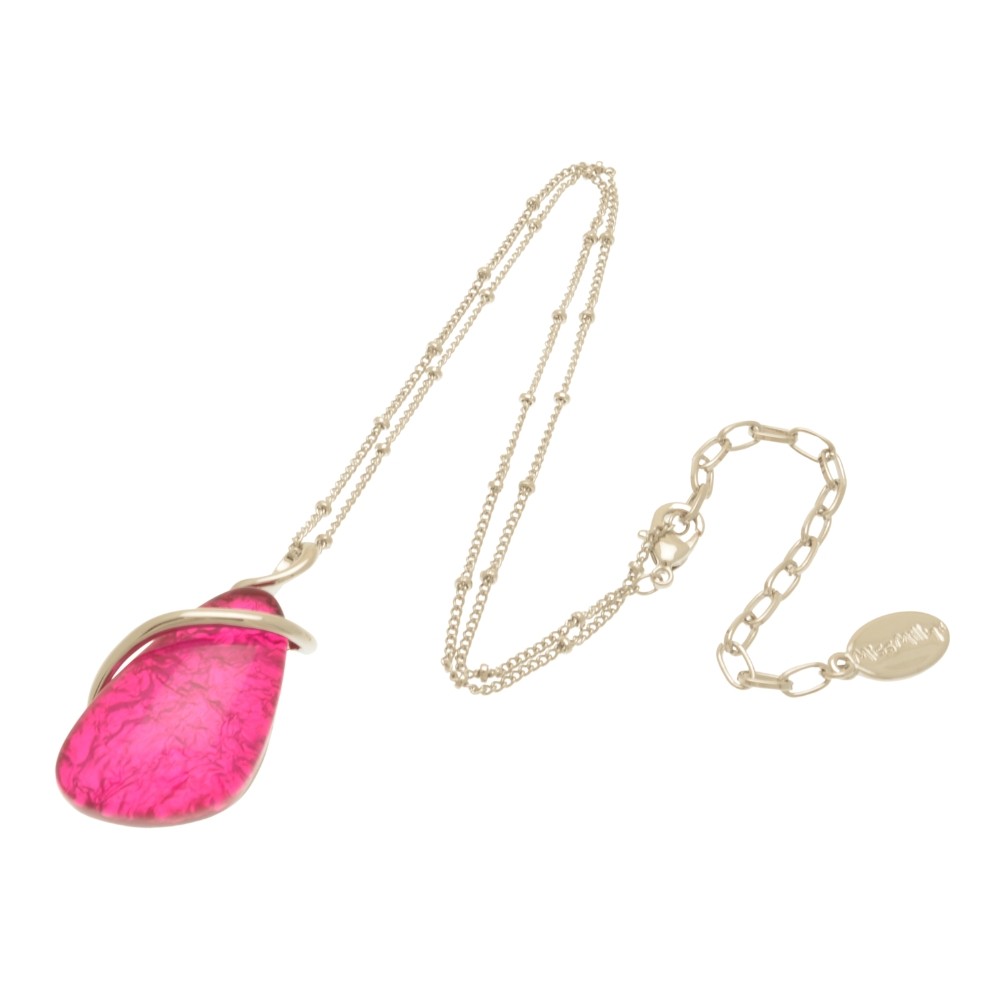 Bold and vibrant, the Fuchsia Pink Drift Necklace shines with energy and colour. The vivid pink resin centrepiece, with its shimmering depth, is gently embraced by a sleek silver curve; a modern design that radiates confidence and style whilst being easy to wear. The pendant is 4cm high by 2.2cm wide and hangs from a knotted style chain. The necklace fastens with a lobster clasp and 8cm extender.