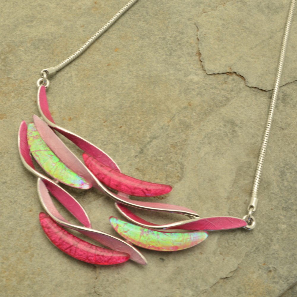In an eye-catching mix of marbled and iridescent bright and light pinks, this lovely necklace uses waves as its inspiration with painted elements and pieces of resin. The decorative piece measures approx 8.3cm wide by 4.5cm high. The necklace measures 41cm or 16″ and fastens with a lobster clasp and 8cm extension chain.