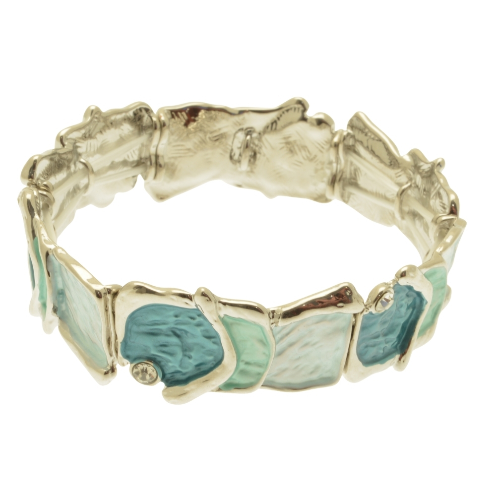 Carefully handpainted with a flow of aqua blending from dark sea green to the palest hint of green, and veins of silver-coloured metal running through, this contemporary bracelet is an unusual, eye-catching design. The pieces measure approximately 2cm high and the bracelet is elasticated, making it easy to put on and take off, and suitable for different wrist sizes.