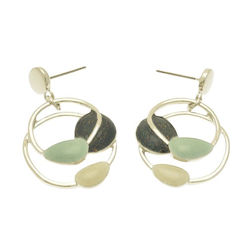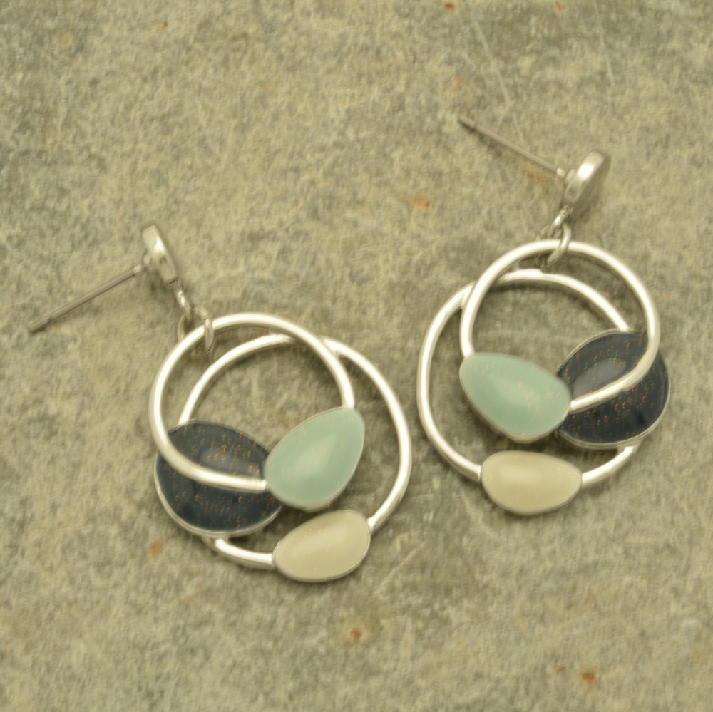 Using a sparkly, gloss finish these earrings feature a trio of dark green, mint and cream lozenges balanced on a spiral of silver-coloured metal. The earrings are approximately 2cm in diameter and hang from a silver-coloured bead, held in the ear with a post and silicon stoppers.