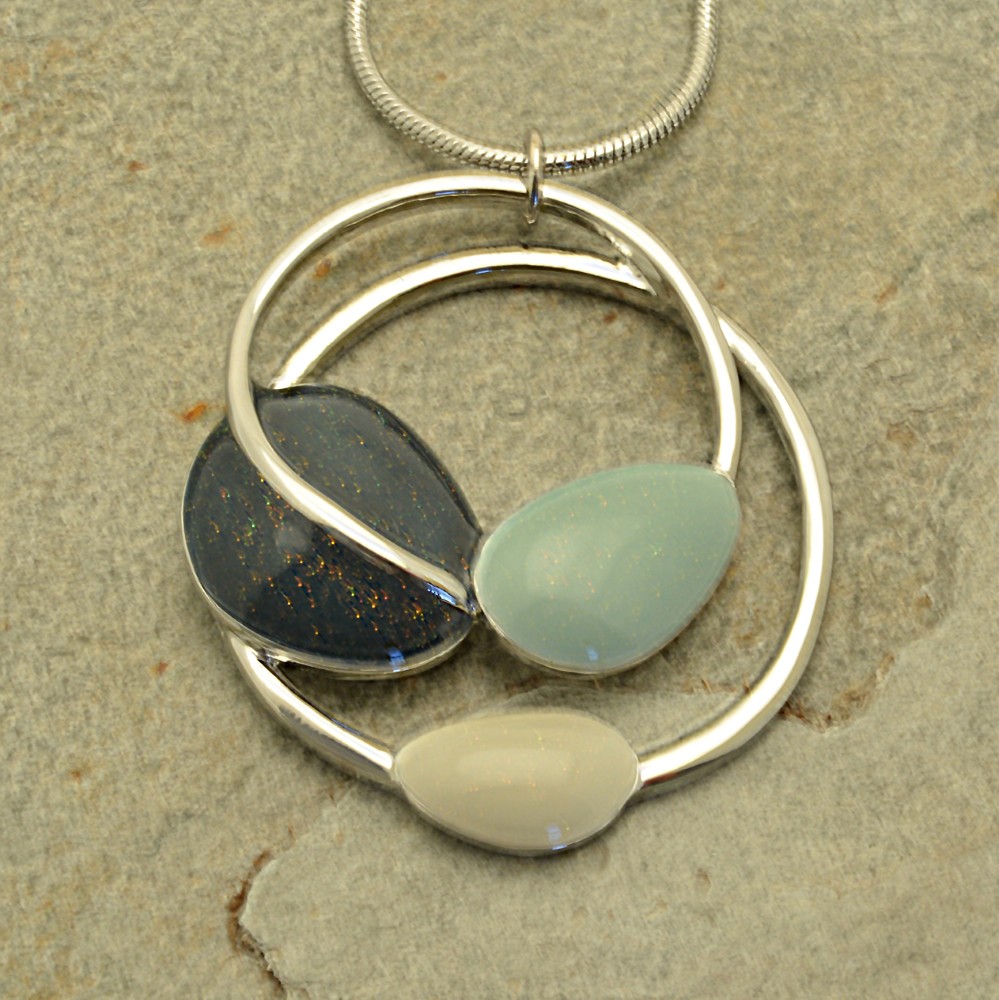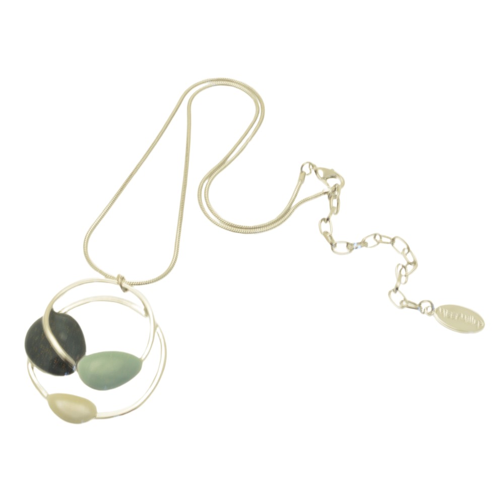 Using a sparkly, gloss finish this necklace features a trio of dark green, mint and cream lozenges balanced on a spiral of silver-coloured metal. The pendant is 4cm high by 3.5cm wide and hangs from a 16″ or 41cm snake chain that fastens with a lobster clasp and 8cm extender.