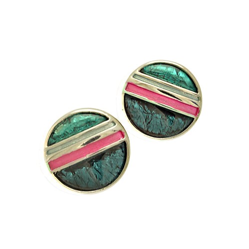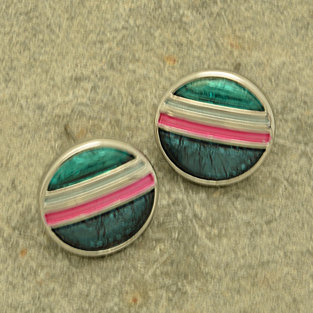 These stylish earrings are like a bright and vibrant green planet with encircling silver, grey and pink moons, and use a combination of resin and paint. The green and blue resins are backed with aluminium foil to create depth and texture. The matt painted bands are in pale green, dark purple and grey. The earrings measure 1.7cm in diameter and are held in place with posts and silicon stoppers.