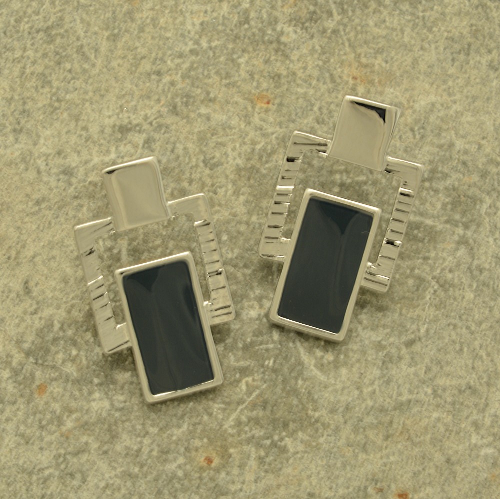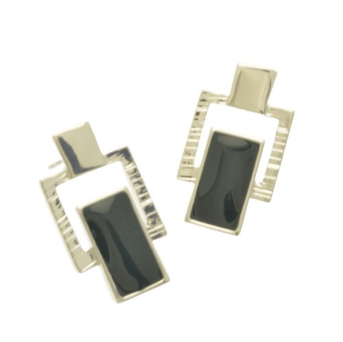 An oblong of glossy dark green sits within a silver-coloured frame topped with a shiny square to create each of these earrings. The earrings are 1.3cm wide and 2.3cm high, and are held in place with posts and silicon stoppers.