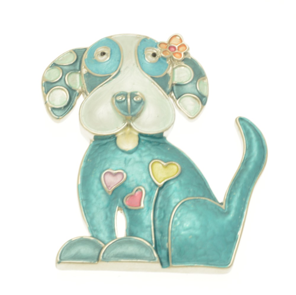 This adorable, aqua green brooch features a cute dog with spotty ears, a flower tucked in one side and hearts on its chest. It’s ready to love you! The brooch is 5.3cm high by 4.8cm wide and is held in place with a strong magnet. It can easily be moved between clothing, hats, scarves and bags without making holes, and can be used to decorate anything made of metal.