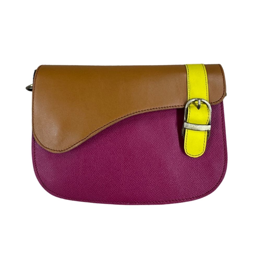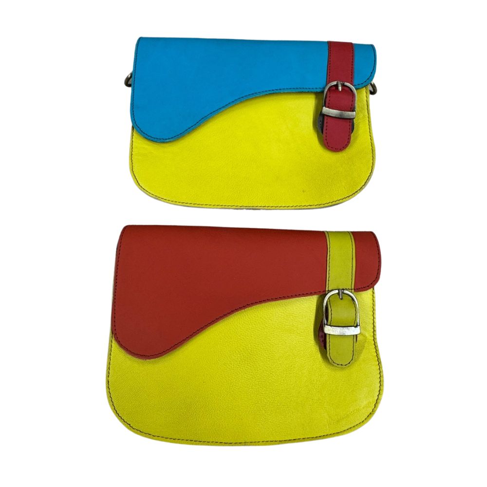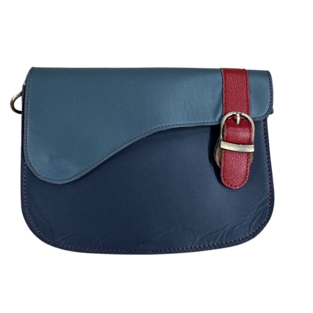 Our stylish, green Inaya Handbag features a curved front flap in a contrasting colour to the rest of the bag with false buckle and magnetic press stud fastening. The rest of the bag is made up from plain coloured leather. The bag features three separated interior sections, including a zipper pocket at the rear. A coordinating, detachable leather strap is packaged inside the bag.