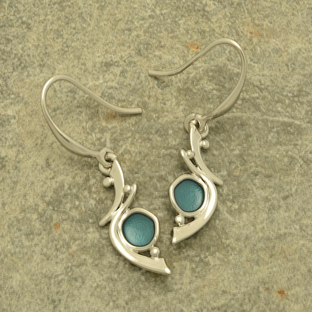 These stylish and delicate drop earrings use a form reminiscent of Katakana, an angular Japanese writing system. They feature handpainted dips in dark green amidst the shiny silver-coloured metal. The earrings are 0.7cm wide and hang 2cm down from French Hooks that are held in place with silicon stoppers.