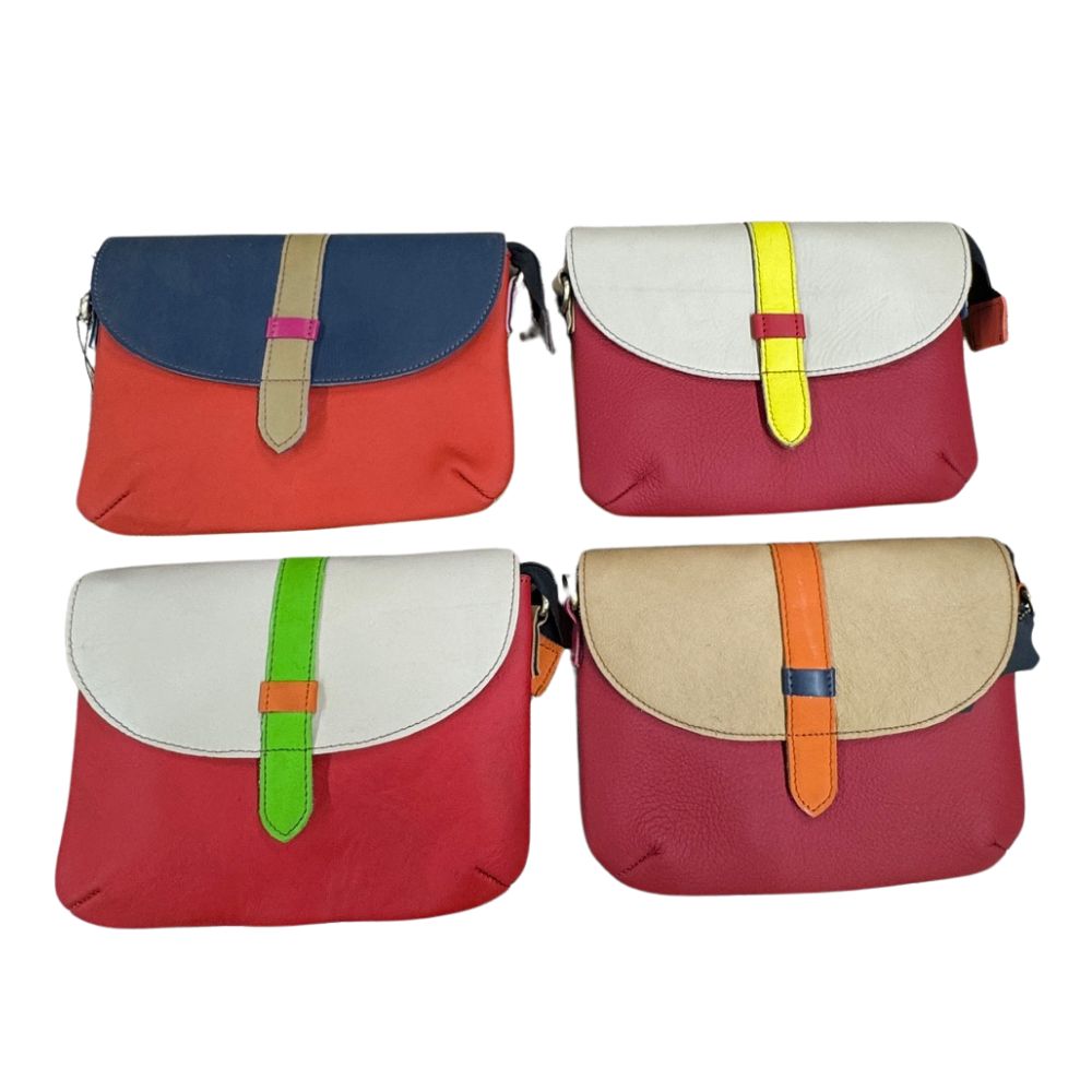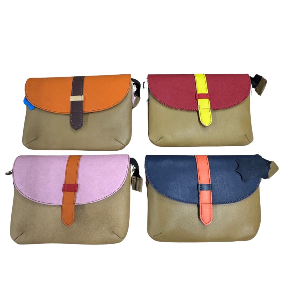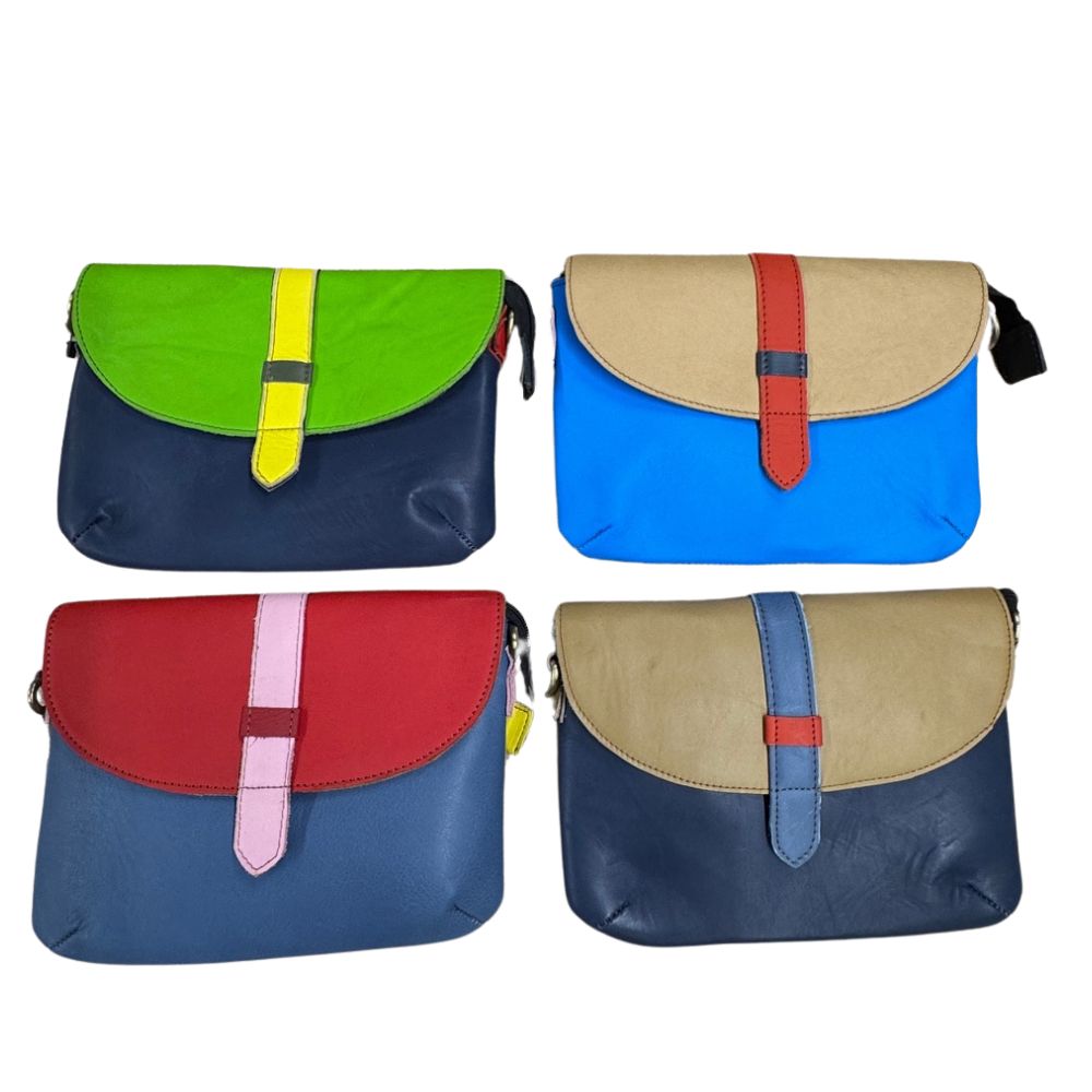 Important: the item you receive will not be the same colours as in the photo as the pieces of recycled leather are selected at random and each piece is unique. This is one of their key selling points. However, we have split the bag designs by the main or base colour in order to make it easier for customers to select those closest to what you’d like.