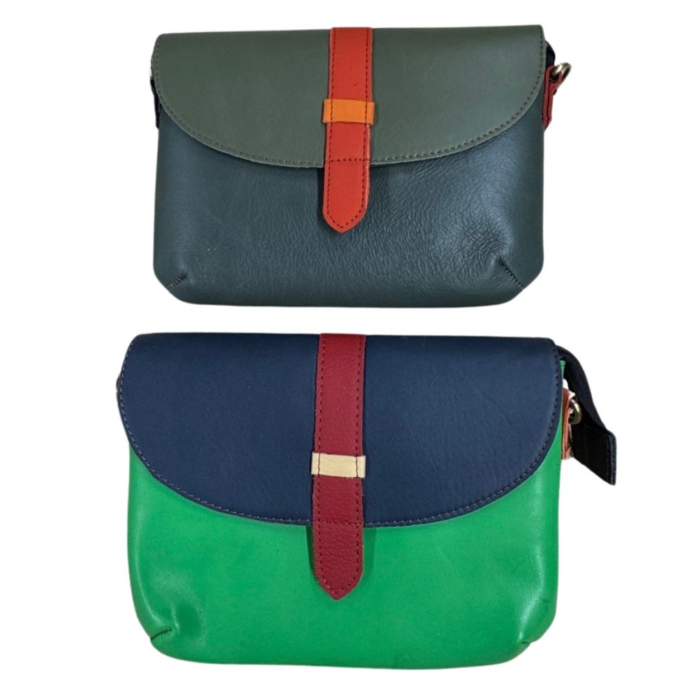 Our gorgeous, green Laila recycled leather clutch bag features a block colour flap with a false buckle strap and magnetic press stud closure. The rest of the bag is made up from a different plain coloured leather. The bag features a zipper pocket on the rear for safe storage with easy access, and the interior has a second zipper pocket. A coordinating, detachable leather strap is packaged inside the bag for versatility so that you can also use it as a shoulder bag.