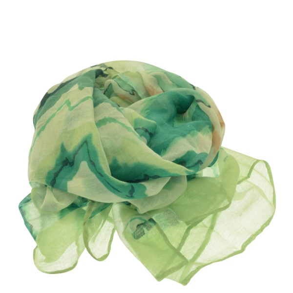 Green mountain ranges cross this lovely scarf with the darker and lighter shades creating perspective. The scarf is made with 100% soft viscose and measures 180cm by 85cm and weighs 80g. It can be washed at 30 degrees Celsius but handwashing is preferable.