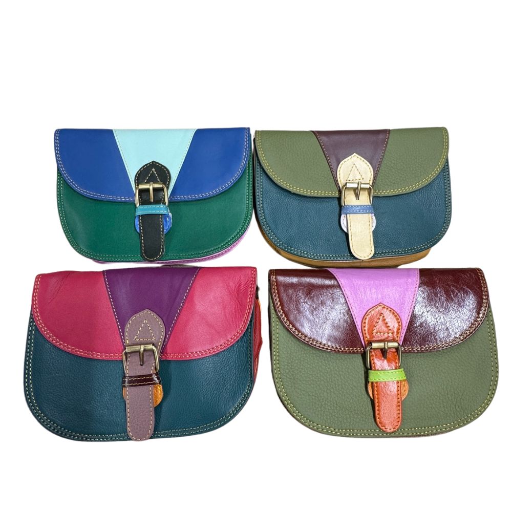 The compact, green Shreya recycled leather handbag has a tricolour front flap with false buckle and magnetic press stud closure. Perfect for carrying your phone, keys and cards or cash, the rest of the bag is made up from different, plain coloured leathers. Inside the bag is a fabric-lined compartment with zipper pocket. A coordinating, detachable leather strap is packaged inside the bag. It is adjustable in length so that you can carry the bag on your shoulder or wear it across your body.