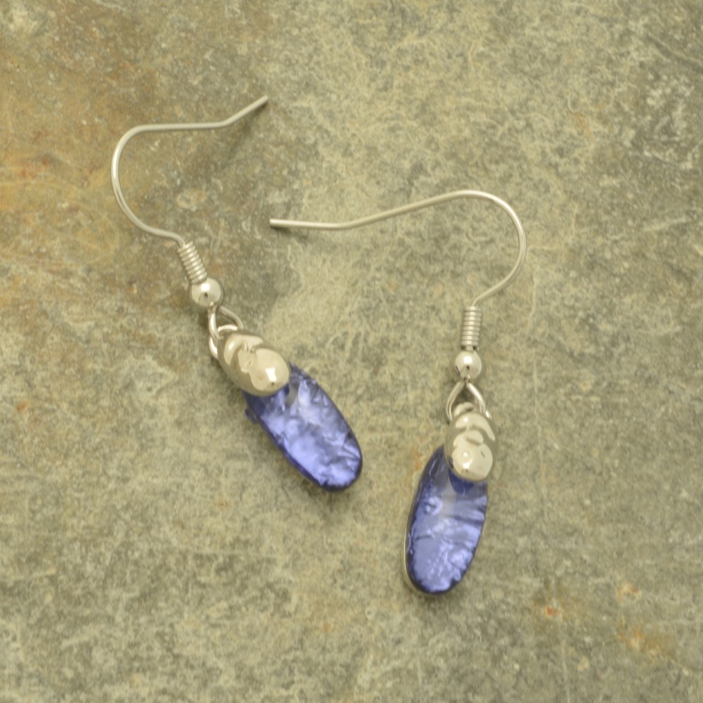 A simple, indigo resin droplet hangs with a hammered silver metal adornment. The resin is backed with aluminium foil to give it depth and lustre. These pretty purple-blue and silver earrings measure 1.5cm long and hang from fishhooks.