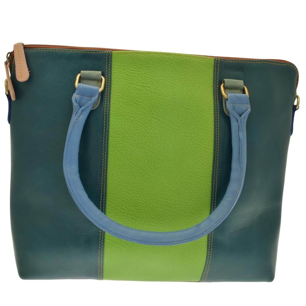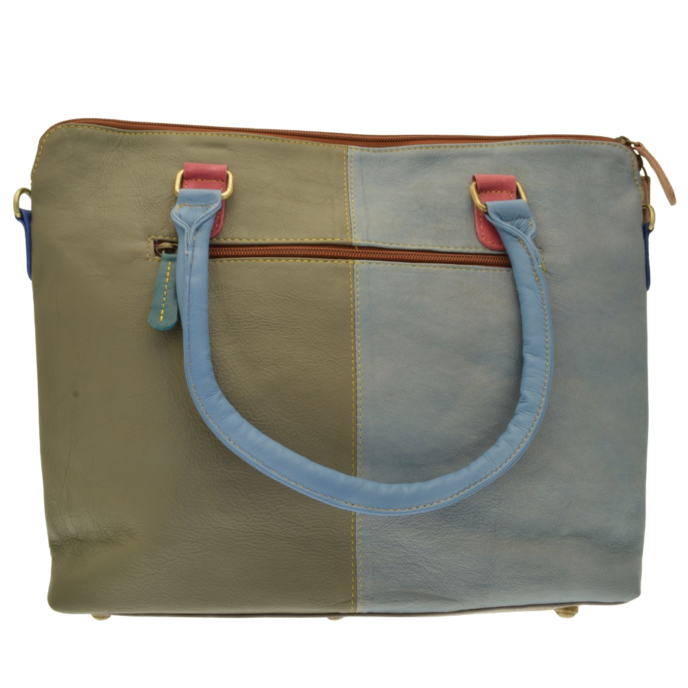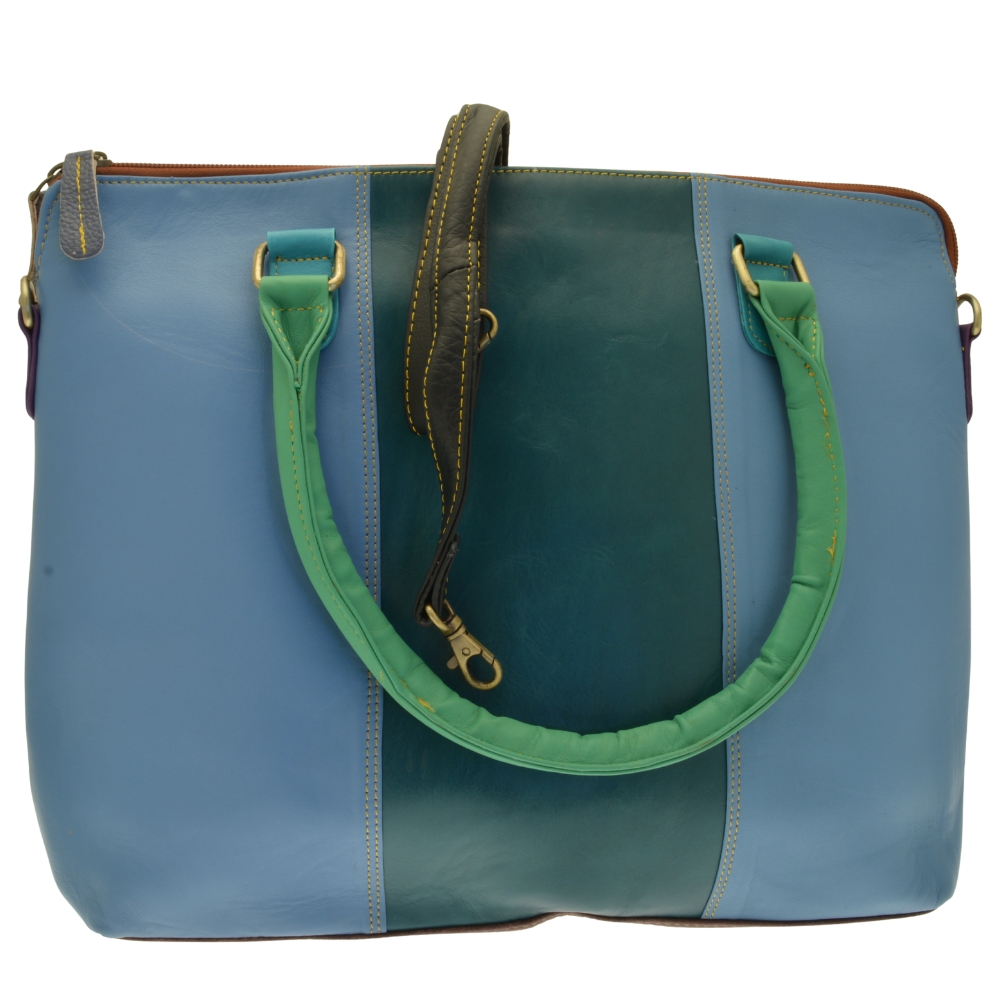Every Jiya handbag is unique, being handcrafted in India from offcuts discarded by the leather trade so no two handbags will feature the same colour combination. Please note that colours and textures may vary due to the nature of recycled leather. The handbag measures approximately 40 x 31.5 x 11cm and the shoulder strap is 1.9cm wide and adjustable in length.