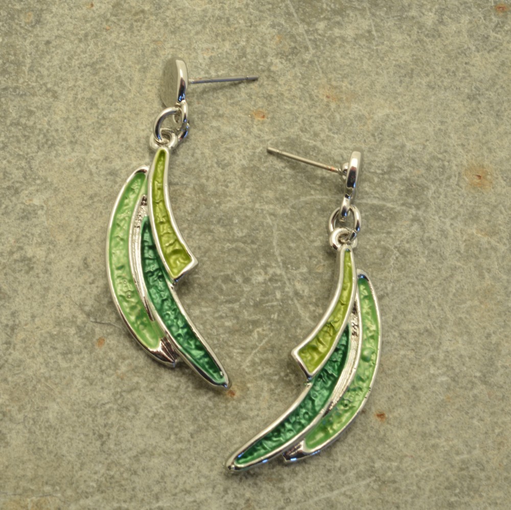 The name of these earrings was inspired by the names of the featured green colours; Amazon, Poison and Lime. They are vibrant, curved drop earrings measuring 1.5cm wide and hanging 4cm from the base of a silver-coloured bead, which is secured in the ear with a post and silicon stopper.