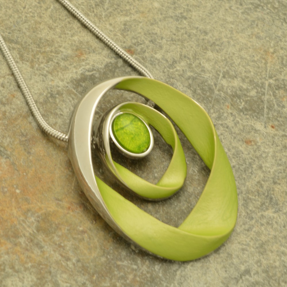 Like swathes of ribbon twirling from a rhythmic gymnast, this pretty lime green necklace features a bead of marbled resin at its centre. The pendant is 4cm high by 3cm wide and hangs from a snake chain of 41cm or 16″ long. The necklace fastens with a lobster clasp and 8cm extender.
