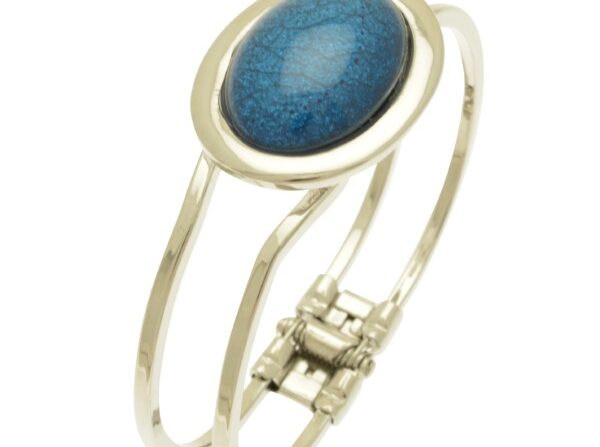 This mid blue bangle is our most popular style of bracelet and uses a resin backed with marbled paper to give it texture. It has a hinged clasp making it a universal fit. The oval decoration measures approx 3cm by 2.5cm.