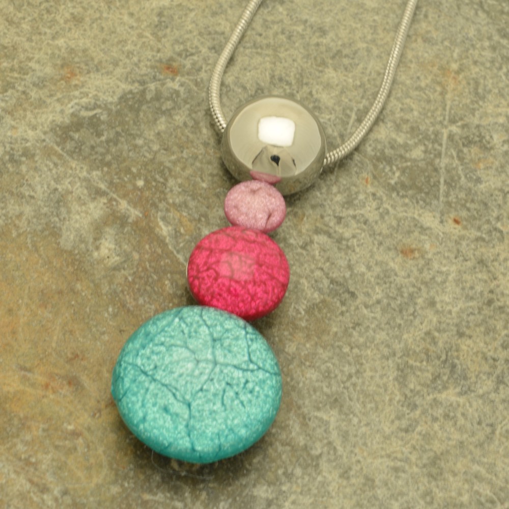Pretty shades of mint green, fuchsia pink and light pink pack a colourful punch for a delicate pendant. The pendant measures approximately 3.5cm long and hangs from a 41cm/16″ snake chain with 8cm extender.