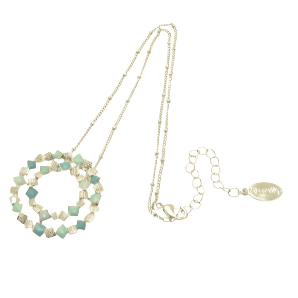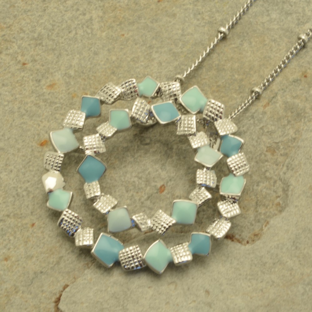 Like a wreath of delicate, confetti squares in mint, aqua and textured silver, this pretty pendant hangs from a knotted style chain. The pendant is 3.5cm in diameter with a chain of 16″ or 41cm that fastens with a lobster clasp and 8cm extender.