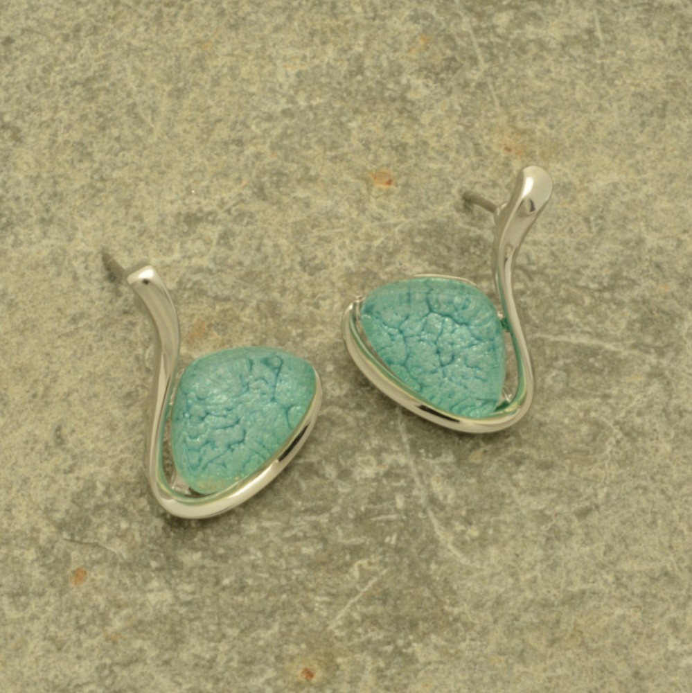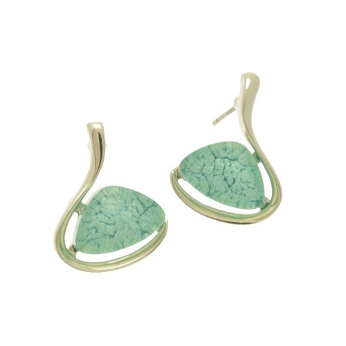 To create these earrings a pretty, mint green, spherical resin triangle sits within a curved swing of silver-coloured metal. The resin has a foil backing, which gives it lustre and depth. The earrings measure 1.7cm high by 1.7cm wide and are held in place by posts and silicon butterflies.