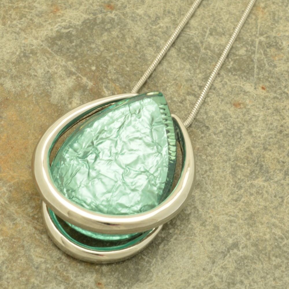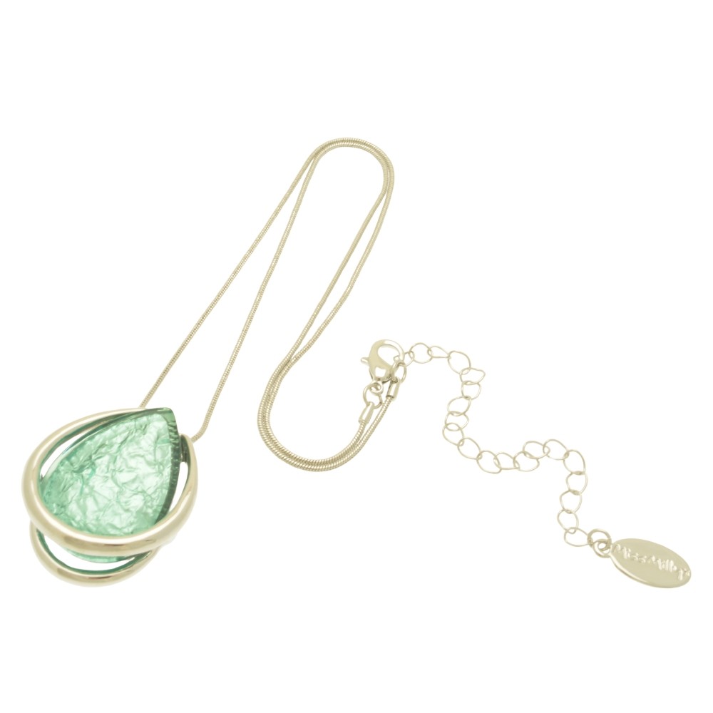 A simple addition of colour is sometimes all you need and this understated mint green pendant may be just the thing. It is made with a resin backed with aluminium foil to give it depth and texture. The pendant measures approximately 4cm long and hangs from a 41cm/16″ snake chain fastening with a lobster clasp and 8cm extender.